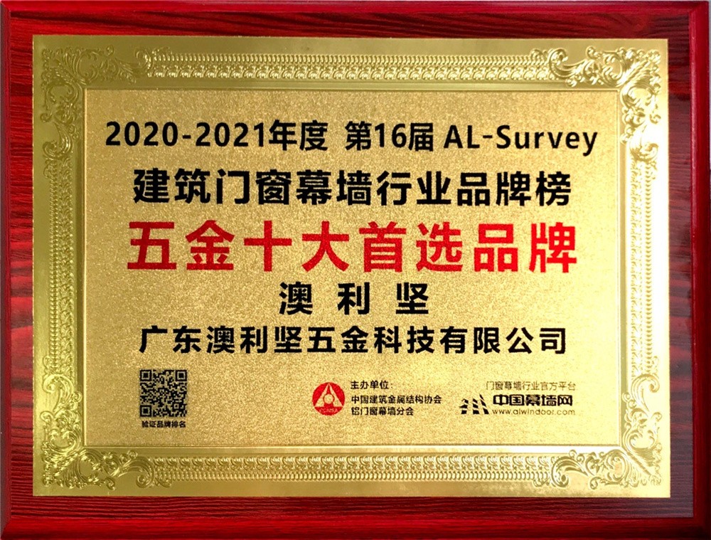 In 2021, Aurican Company awarded the honor of Top Ten Preferred Brands of Hardware in the 16th AL-SURVEY Brand List of Building Doors, Windows and Curtain Wall Industry in 2020-2021 again, which is of great significance to establish the brand image of the company and improve the market competitiveness.